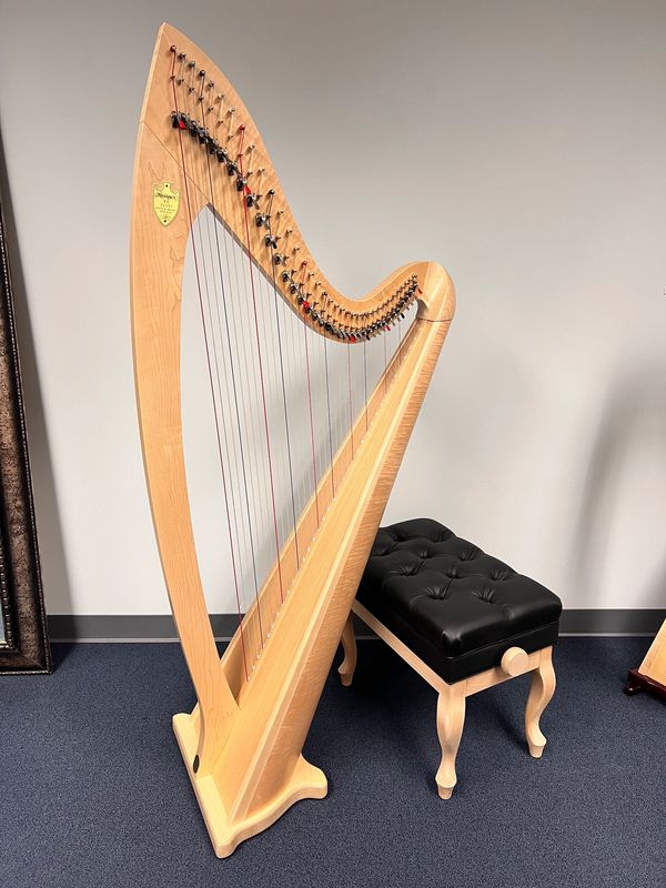 The stunning classic that most of us began on, the Troubadour VI is a striking harp to take on your harp journey. Strung with gut and nylon strings. Price $5,500 plus tax; bench - $380
