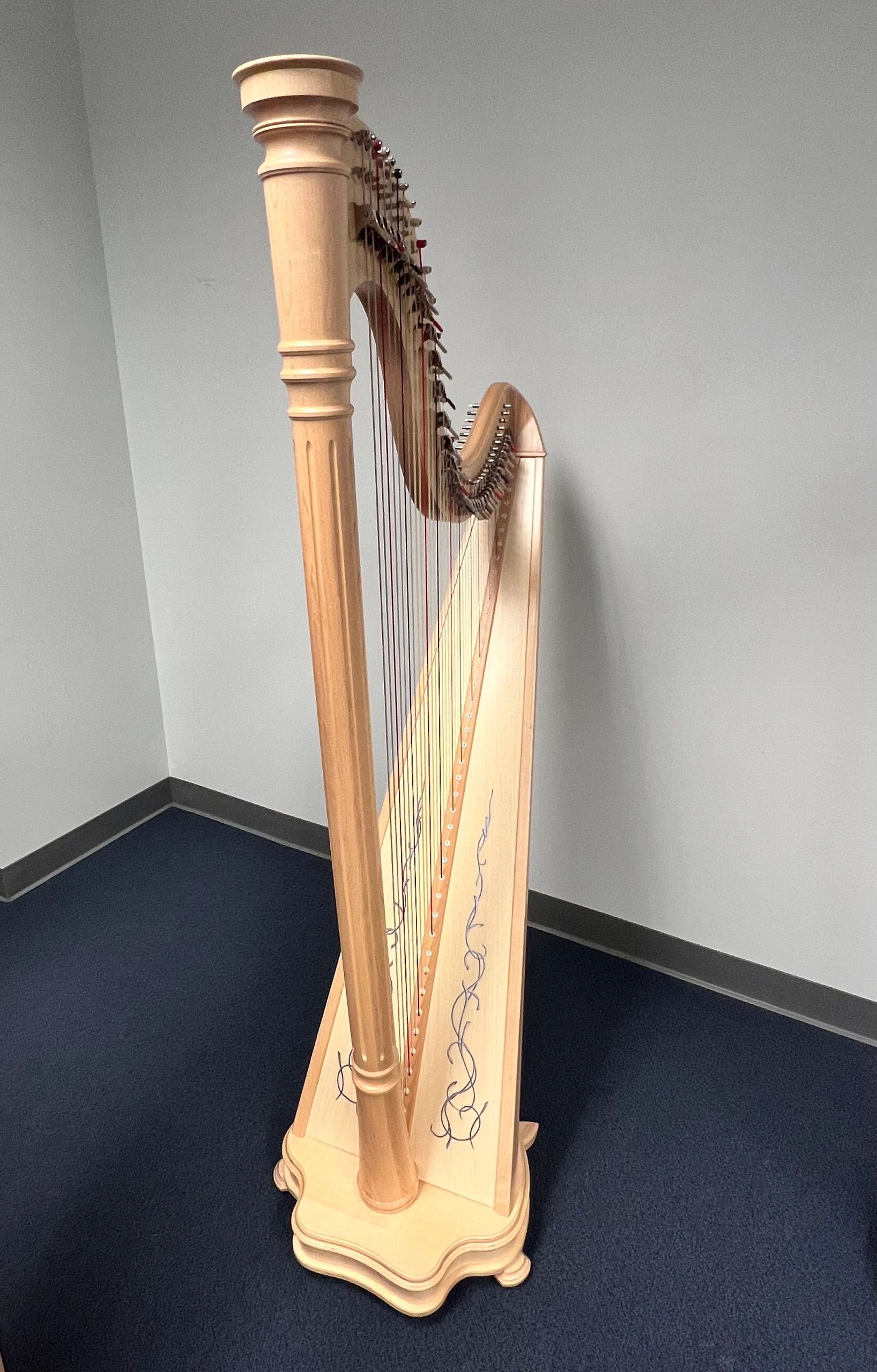 Maple and cherry finish, serial #1425. This little beauty has 36 strings, stands 31 inches tall, and features a decorate mother of pearl inlaid S on the column. Manufactured in 2015, it has the extra feature of lights installed on the neck that allow playing in low light. Includes tuning key, deluxe carrying case, Manhasset music stand, extra strings, and some sheet music. Priced at $4,000 plus tax