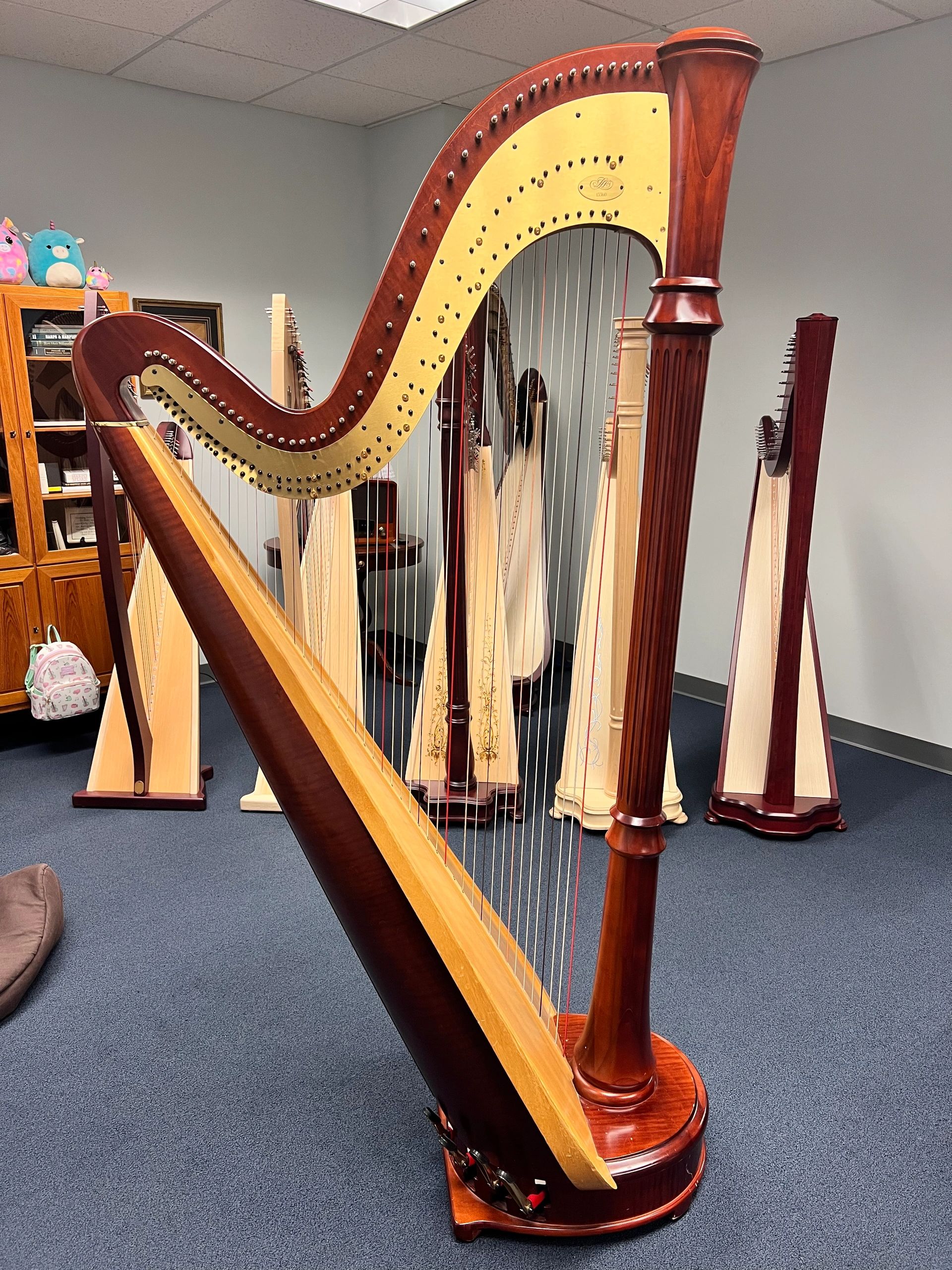 Priced attractively at $15,900, this beautiful harp with full warm sound was made in the 90s and sold as is. Comes with padded base cover and dust cover.